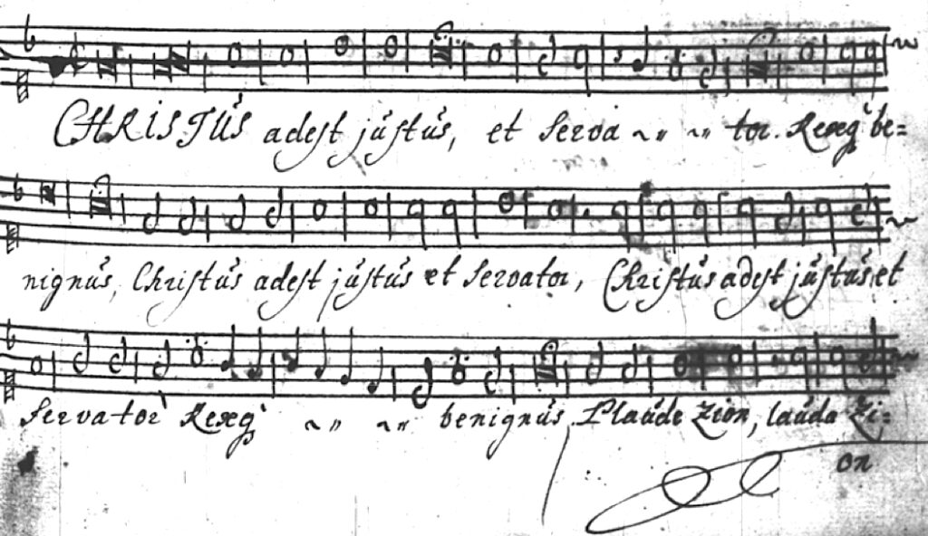 - Christus adest justus -kappaleen sopraanostemman alku Porin triviaalikoulun nuottikirjasta.